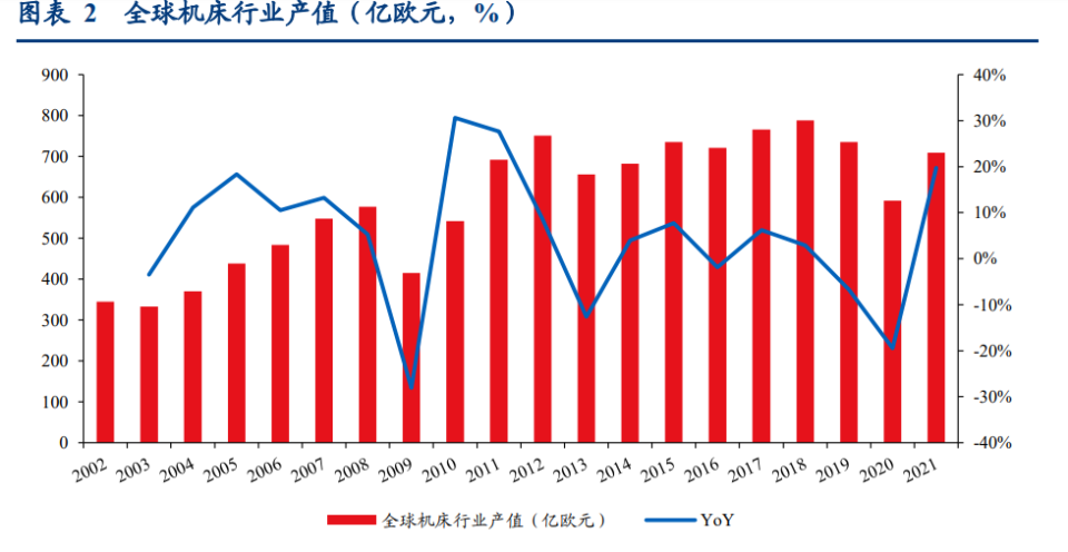 机床在航空航天、汽车、能源和消费电子等行业中的应用广泛。据德国机床制造商协会数据显示,全球机床行业产值从2002年的345亿欧元增长至2019年的735亿欧元,复合增长率为4.55%。然而,2020年受疫情影响,全球机床行业产值大幅下滑至592亿欧元。不过,到了2021年,行业开始复苏,产值回升至709亿欧元。