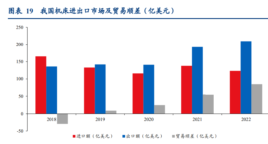 从进出口市场的角度来看,2022年我国机床进/出口额分别达到124/210亿美元。2018-2022年出口额复合增长率为11.4%。在贸易差额方面,我国机床市场在2019-2022年持续呈现贸易顺差,并逐年上升至2022年的85.5亿美元。尽管我国机床制造水平和配套产业链得到了快速提升,但高端机床的对外依赖度依然严重。